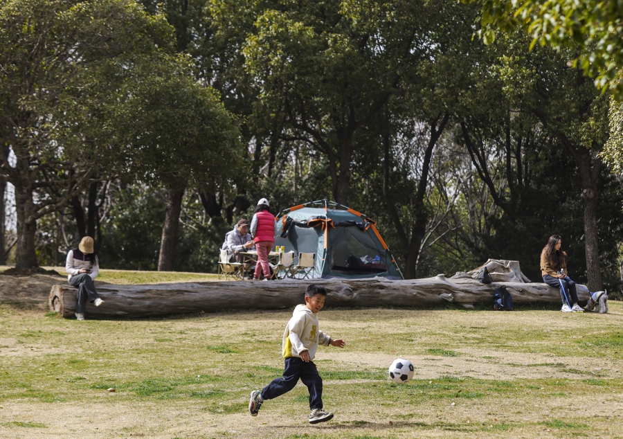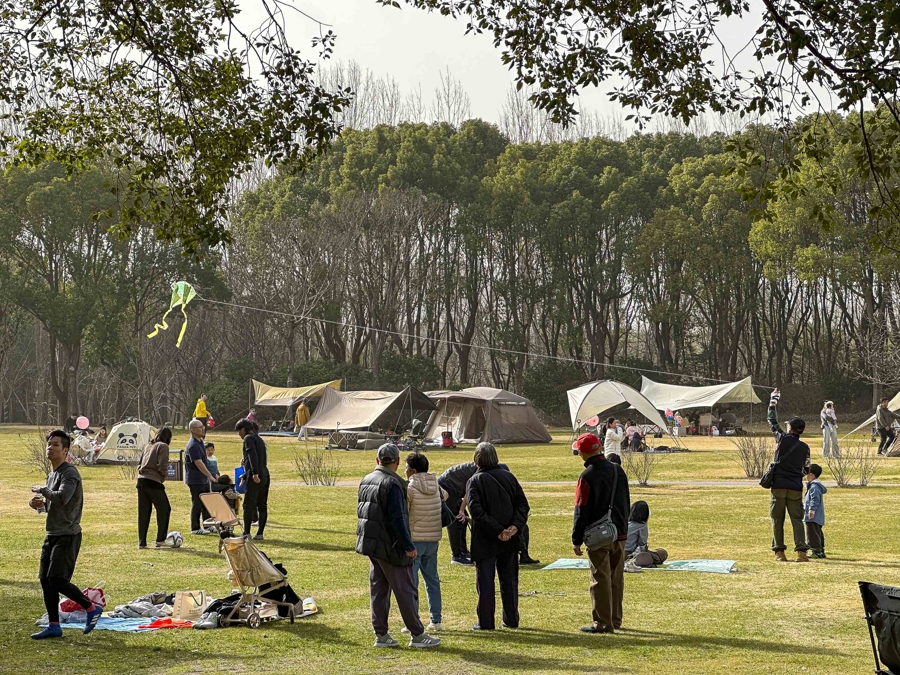 顾村公园人气聚集。樱花林中,大渔樱、钟花樱等早樱品种在气温催化下悄然绽放,粉白花瓣缀满枝头,景致清新雅致,吸引游客驻足拍照。园区游乐园里,家长带着小朋友尽情游玩,欢声笑语此起彼伏;大片草坪上支起了成片的露营帐篷,市民围坐其间闲谈休憩,沉浸式亲近自然,享受假日的惬意时光。